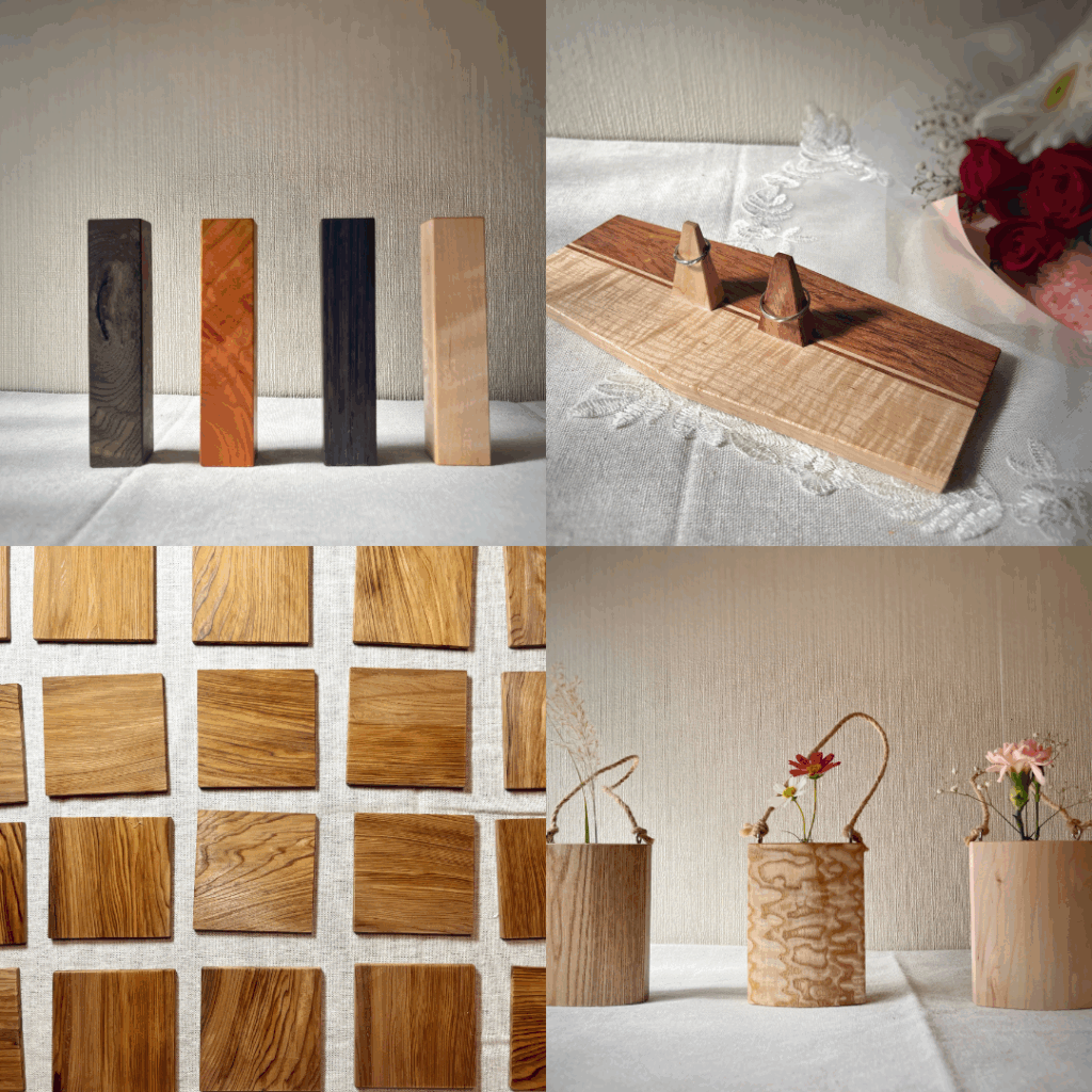 コースターや一輪挿し、指輪スタンド、カッティングボードなど。