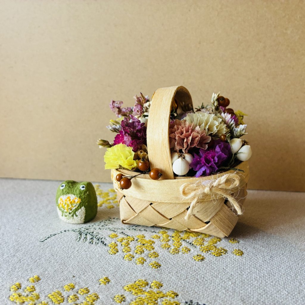寒さもまだまだ厳しい毎日ですが、ほんの少し春色の小さなドライフラワーバスケットを作りませんか?