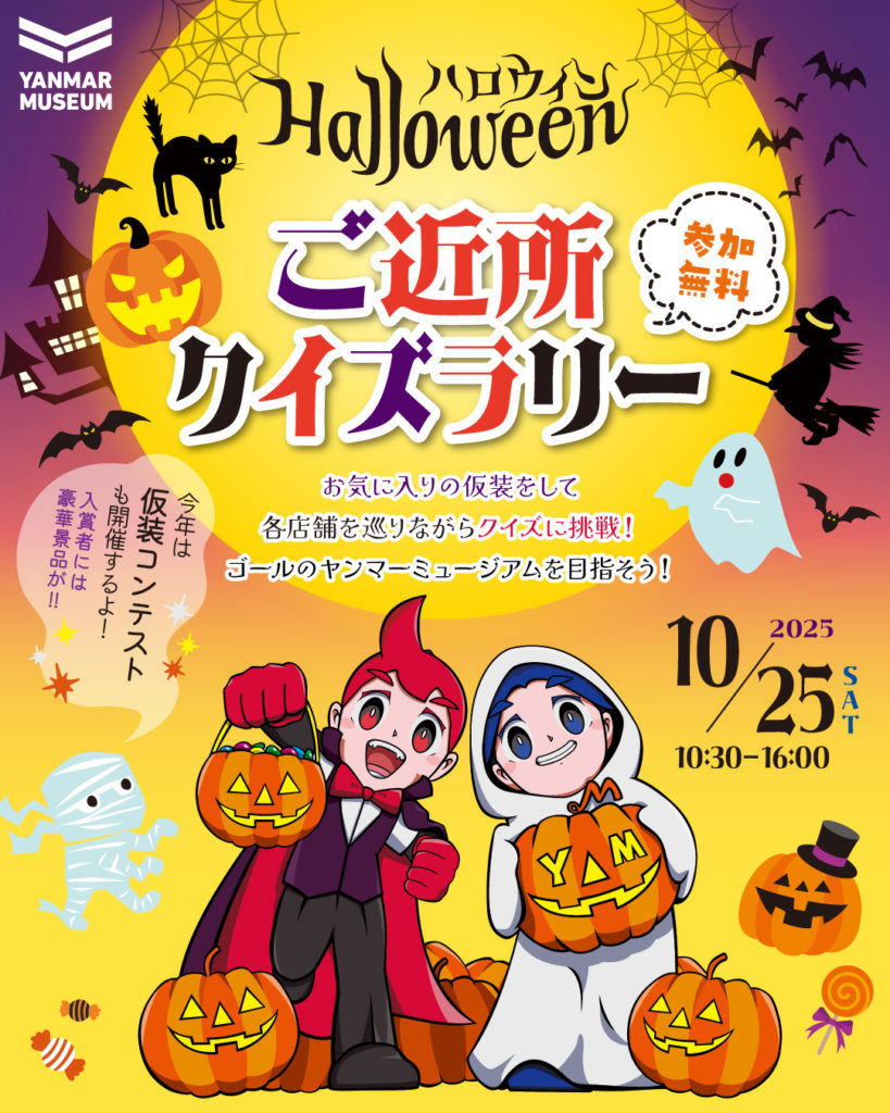 【イベント概要】 ハロウィンの仮装をして、ヤンマーミュージアム周辺を散策しながらクイズラリーを楽しみませんか⁉【10/27(日)☆ハロウィンご近所クイズラリー】をヤンマーミュージアムご近所の14店舗様と一緒に開催致します!※ご近所店舗様はヤンマーミュ...